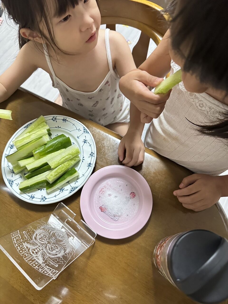 じぃじの家で採れたキュウリを2人